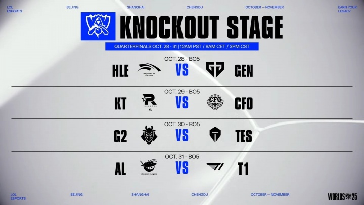 直播吧10月25日讯 S15八强对阵公布,具体赛程如下: