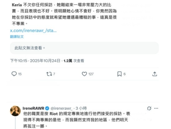 直播吧10月26日讯 西班牙记者Irenerawr在X上发布了一篇对T1辅助选手keria的采访,表示keria采访时状态不佳,并且晒出了keria的一张“臭脸”照片;
