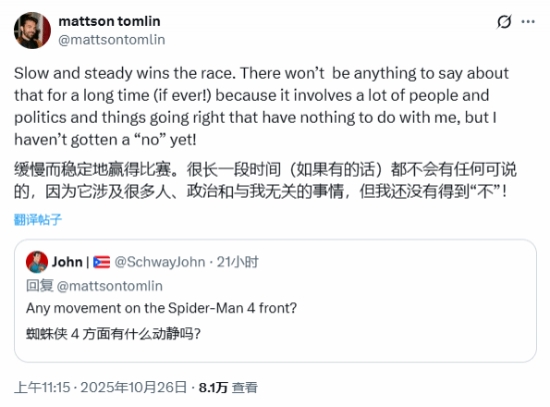 如今,又一位创意力量加入了这场热议——《蝙蝠侠》及《蝙蝠侠:第二部》的编剧马特森·汤姆林公开表示,他愿意为马奎尔的《蜘蛛侠4》献力。今年7月,汤姆林在X平台上明确表示,他有兴趣为马奎尔的蜘蛛侠打造第四章故事。