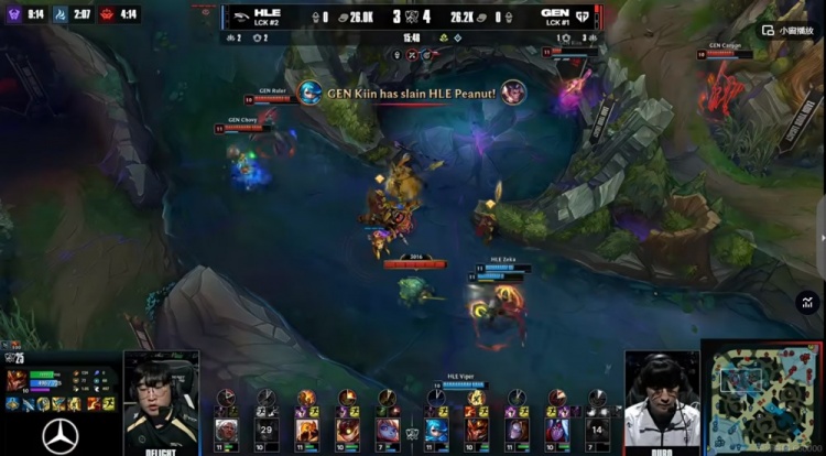 【15:30】先锋团Viper炸弹人poke打残Duro泰坦还逼了个闪,但是TP落地的Zeus安蓓萨直接被开,被迫交闪回龙坑!HLE拿下先锋,GEN强开结果是Duro泰坦和Peanut赵信互换!双方拉开!随后Duro泰坦河道被HLE四人强杀!二连死!