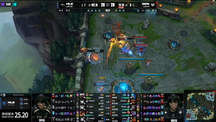 【53:07】HLE中路四人逮捕了Kiin格温!格温用了金身拖时间但是还是白给了!随后Zeus安蓓萨交TP+复活甲逼退了GEN众人!GEN也只有推掉上路的高地!HLE反推掉中路高地塔!双方再次拉开!