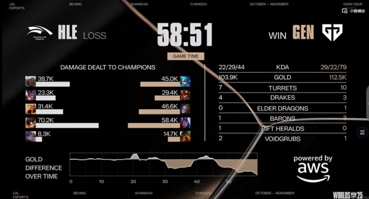 GEN的危机时刻Chovy发条站了出来,高地团大招卷死HLE野辅帮助队伍守住!随后远古龙团Zeka沙皇吃钩白给,GEN拿下远古龙+大龙,但是推进阶段被HLE四人逮捕了Kiin格温,GEN被迫后撤没法一波!决胜远古龙团GEN抓住HLE正面人不齐的机会强杀Peanut赵信,HLE阵型被冲散,Zeka沙皇再次没了啊!仅剩的Zeus+Viper守不住了!GEN一波结束比赛,手握三个赛点!