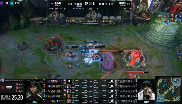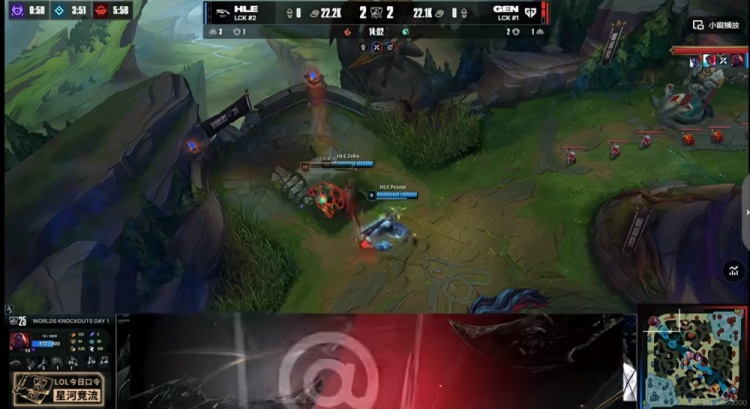 【22:48】HLE野区依靠Delight洛先手又逮捕了Ruler卡莎!双方互换一座边路一塔,GEN三人上路强杀Zeus兰博,HLE拿下海克斯龙听牌了!双方经济差3000多!
