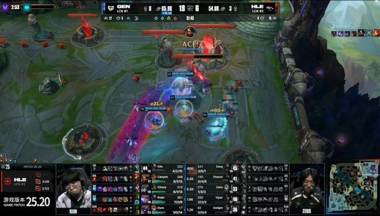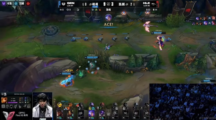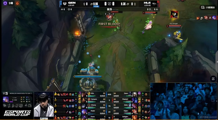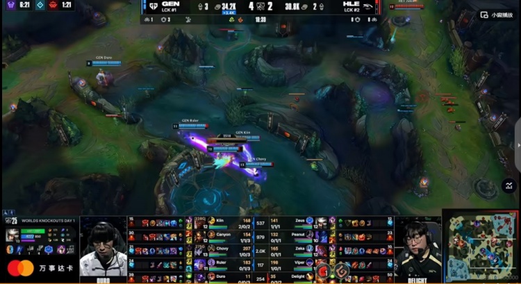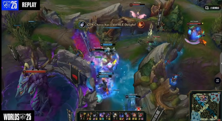 【20:30】HLE河道强开Chovy彗,虽然将他击杀但是太慢了!被Chovy彗拉满了输出!Canyon豹女+Ruler芸阿娜支援赶到带队追击,HLE双C最终一个都没跑掉!GEN团灭HLE,回头拿下厄塔汗!6K经济差了!