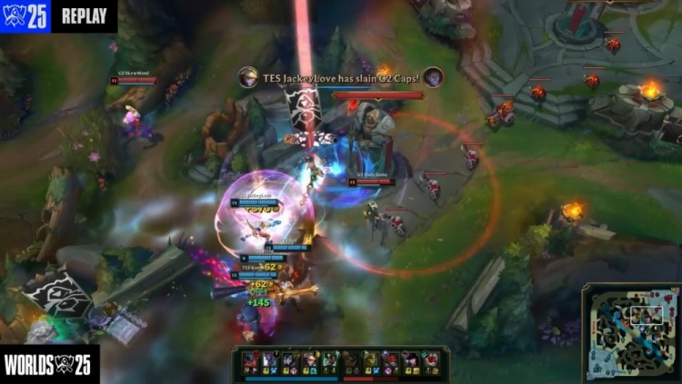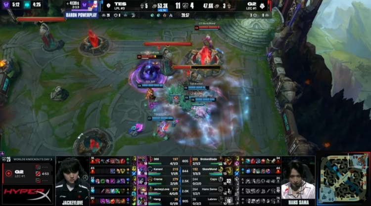 第三局前期SkewMond艾翁上路gank击杀369剑魔,随后SkewMond入侵TES野区没能点到Labrov锤石灯笼被杀,双方持续发育,经济差距不大。