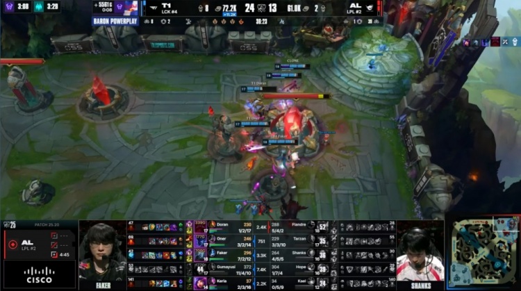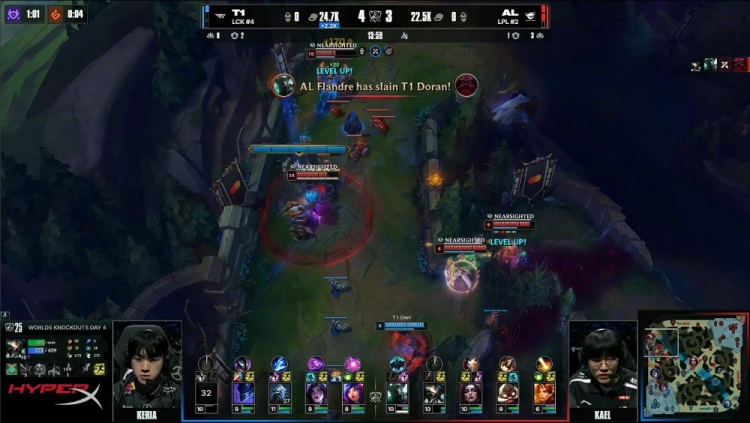 【25:58】大龙团,小吕布见面先杀王杰,Faker维克托死前击杀Shanks,Flandre铁男反手再杀Keria妮蔻,Tarzan蝎子再拉T1三人,双方打出3换3,T1经济领先3k。