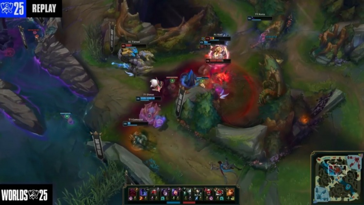 【7:50】上路混战,多兰奥恩配合Oner梦魇关灯叫羊,小吕布卡莎飞脸击杀Kael女坦,王杰飞机跟着阵亡,Tarzan蝎子大招拉T1三人,Shanks妖姬反手双杀,Keria妮蔻补掉残血Shanks妖姬,T1打出2换4。