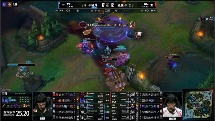 【17:25】先锋团,Oner梦魇关灯吃掉先锋,Keria妮蔻开到王杰,小吕布飞脸拿到王杰人头,正面混战,Tarzan蝎子拉到小吕布,小吕布反手击杀Shanks妖姬,T1中路放出先锋撞掉AL一塔,T1打出0换4,经济领先5k。
