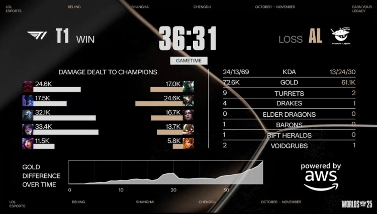 直播吧10月31日讯 2025全球总决赛淘汰赛1/4决赛焦点之战,由AL对阵T1!