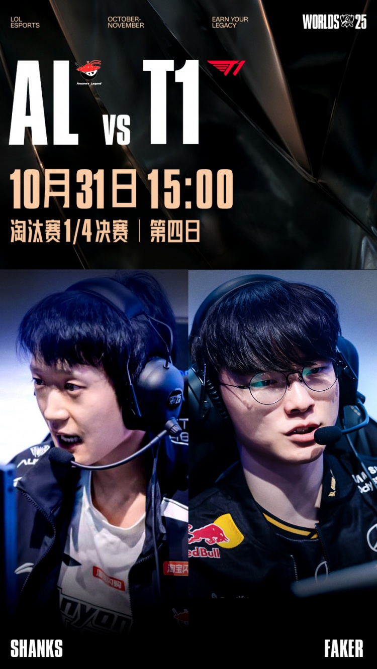 直播吧10月31日讯 2025全球总决赛淘汰赛1/4决赛焦点之战,由AL对阵T1!