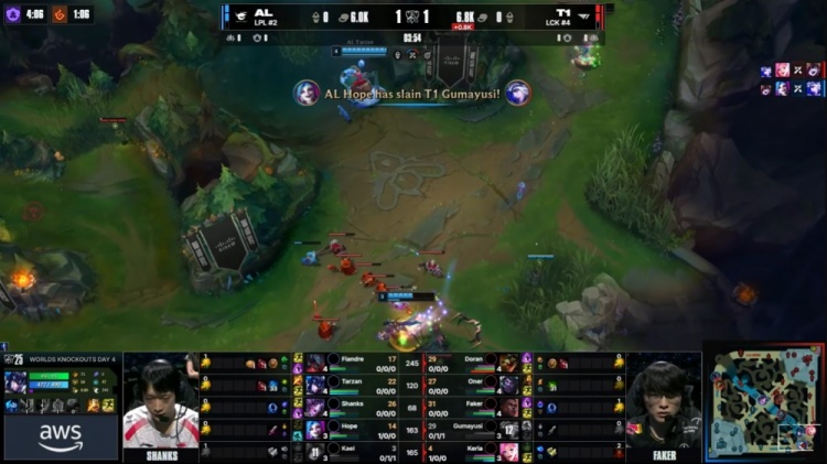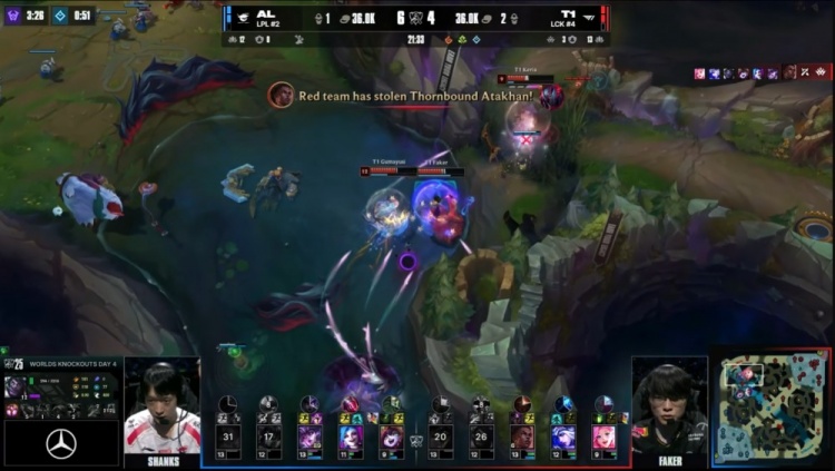 中期厄塔汗团战,Faker梅尔先杀Tarzan再杀Flandre后抢掉厄塔汗,双方打出2换2。龙魂团Oner蒙多抢掉电龙魂,Shanks辛德拉中路一晕二融化多兰鳄鱼,Flandre砍掉Faker,AL打出0换3,经济领先3k。