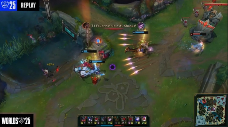 【12:14】河道团战,Flandre剑魔砍掉Keria,王杰金克丝击杀Oner蒙多启动,Tarzan补掉残血Faker梅尔,AL打出1换3,双方经济差距不大。