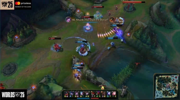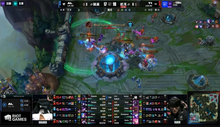 【25:49】大龙团,Oner河道被杀,Flandre剑魔开大中路爆砍Faker梅尔,Shanks辛德拉拿到人头,AL打出0换2,回头去开大龙,T1三人还要来看,AL打出1换4,经济领先5k。
