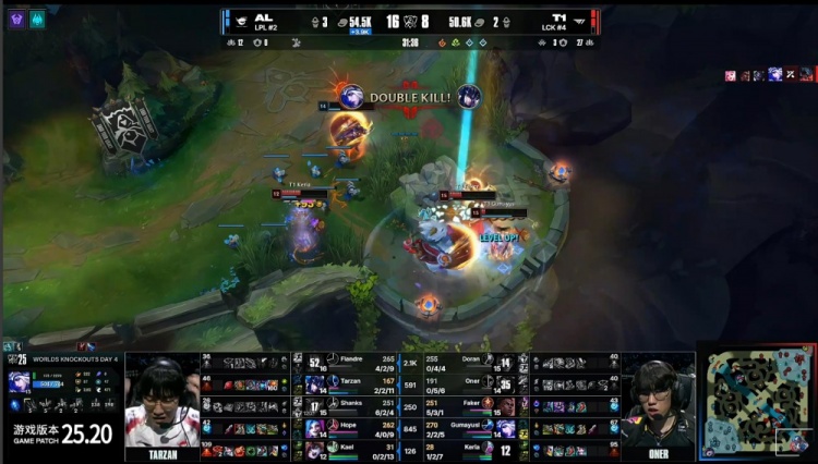 【20:05】中路Tarzan小猪大招定住Oner蒙多,Oner蒙多开大回血,双方拉开,T1三人回头开厄塔汗,AL过来接团,中路河道王杰金克丝三发导弹打残多兰鳄鱼,AL五人到河道开厄塔汗,多兰鳄鱼绕后,正面Tarzan小猪先被Faker梅尔击杀,多兰跟着被换,Oner蒙多没大送王杰金克丝启动,Faker梅尔再杀Flandre后抢掉厄塔汗,双方打出2换2,经济持平。