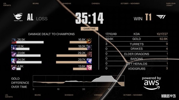 最终T1两路推进,AL高地大军压境,T1仰仗七龙珠强行推平AL基地拿到比赛胜利晋级半决赛对阵TES,AL惨遭淘汰。