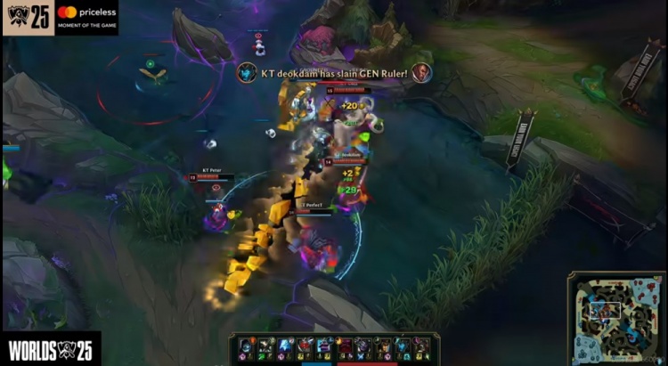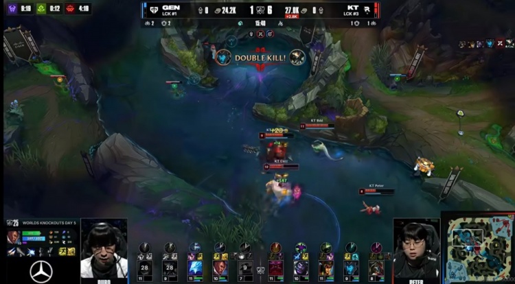 决胜远古龙团前Kiin约里克被抓,但是KT第一波冲锋过急反而被GEN拉扯,自己掉了很多状态和闪现,但是关键时刻Cuzz蒙多抢到了远古龙!Deokdam卡莉斯塔冲锋单切Ruler卢锡安!KT一波4+1结束比赛,淘汰最大夺冠热门GEN,率先晋级本次世界赛的决赛!