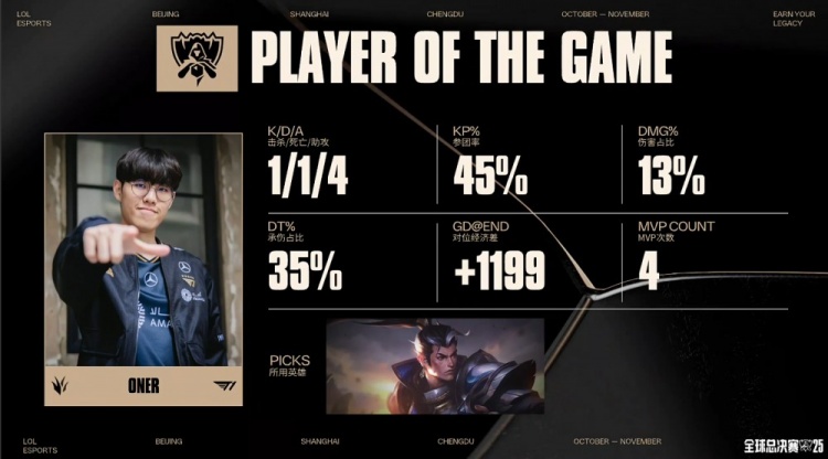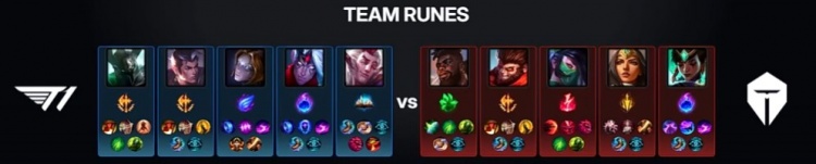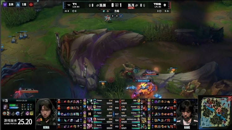 第一局前期双方平稳对线,野区混战Creme阿卡丽果断闪现开大配合Kanavi猴子拿到Oner赵信一血,随后T1连吃两条小龙,TES仅拿到些许经济优势。