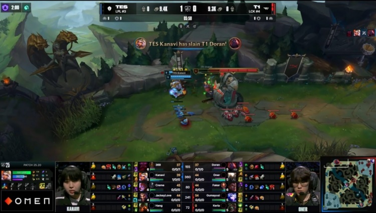 中期Kanavi带hang入侵T1上野区两人换掉Keria烈娜塔,哥哥德莱文中路被T1三人越塔带走,999奥恩河道草丛叫羊头顶脚踢单杀Oner再杀小吕布终结多兰,拿到三杀,TES打出2换3。