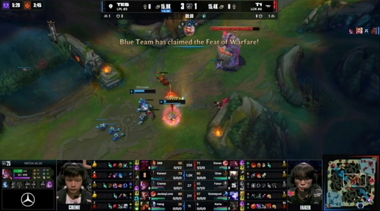 【9:39】Kanavi奇亚娜中路过墙配合Creme阿萝拉开大击杀Faker梅尔,Kanavi吃到一下防御塔伤害,Oner潘森来中闪现戳掉Kanavi大人头。随后TES三人下路越塔强杀小吕布得手,Kanavi奇亚娜拿到人头,但hang泰坦被防御塔击杀被换,双方打出2换2。