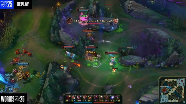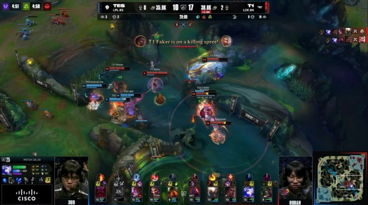 【18:19】河道团战,hang泰坦顶在前面先被击杀,T1顺势入侵TES野区,369奥恩遭集火倒地,T1回头拿到先锋,经济领先2k。