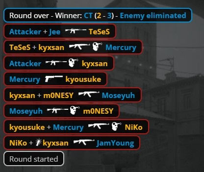 第20局Mercury香蕉道炸飞K3,京介香蕉道换掉小鞠,Monesy大狙在B轰掉白菜,天禄带包转A,Monesy书房回防,龙哥包点换掉Moseyuh,残局2v2,天禄在A下包,Jee小坑击杀Niko,但Monesy大狙狂轰双杀击杀Mercury与Jee后惊险拆包,天禄8-12猎鹰。