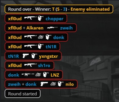 X队上半场先攻,手枪局X队全员来B,donk配合chopper闪光弹双杀,残局ALKAREN先杀tN1R后被chopper带走,绿龙1-0X队。