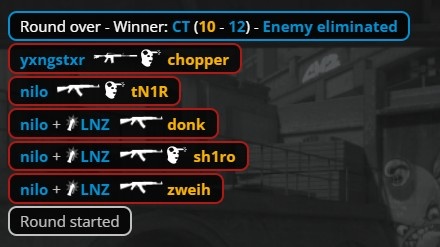 第12局zweih工地先杀Alkaren,donk厕所先杀xfloud再杀yxngstxr,LNZ补掉sh1ro,X队带包转A,zweih先杀nilo在补掉最后一个LNZ,绿龙7-5X队。
