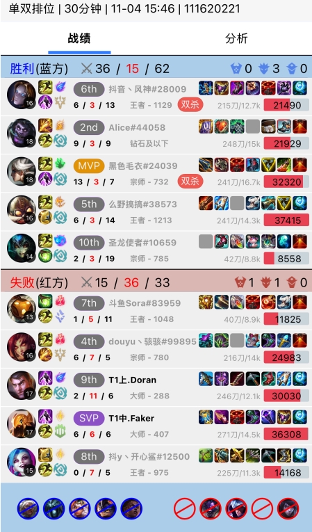 直播吧11月5日讯 根据排位统计小程序显示,Doran近日在峡谷之巅操刀杰斯打出2-11-6的战绩,同队的Faker操刀沙皇打出6-6-6的战绩。