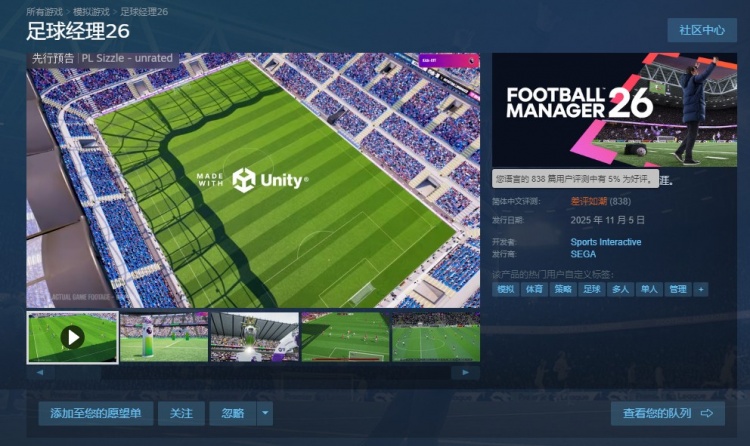 直播吧11月6日讯 根据Steam统计,目前《足球经理26》的简中评价数已经达到了810+,但好评率却再次下跌,目前仅为5%,处于“差评如潮”。