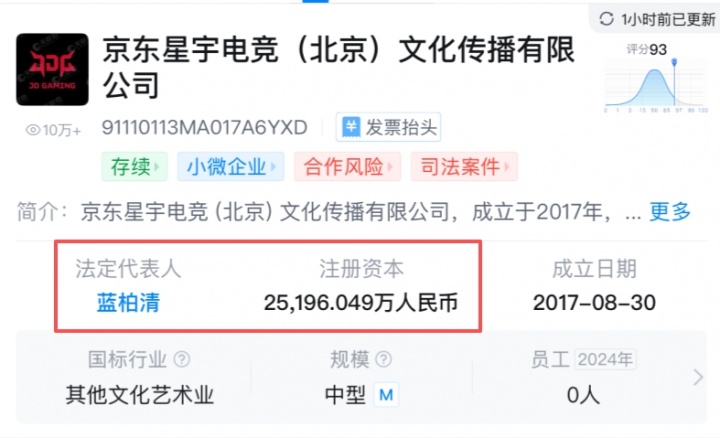 京东星宇电竞(北京)文化传播有限公司成立于2017年8月,法定代表人为蓝柏清,经营范围包括组织文化艺术交流活动、物业管理、计算机及通讯设备租赁等。