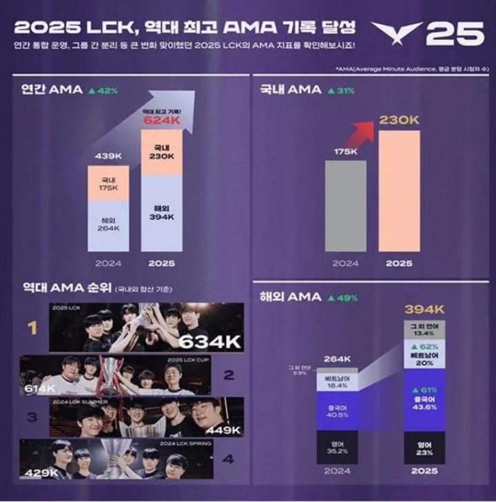 此外,LCK史上首次实现韩国国内年均观众数突破20万人,较去年增长31%。NAVER Chzzk与SOOP知名主播的共同转播(Co-streaming)对观众增长产生了积极的影响。
