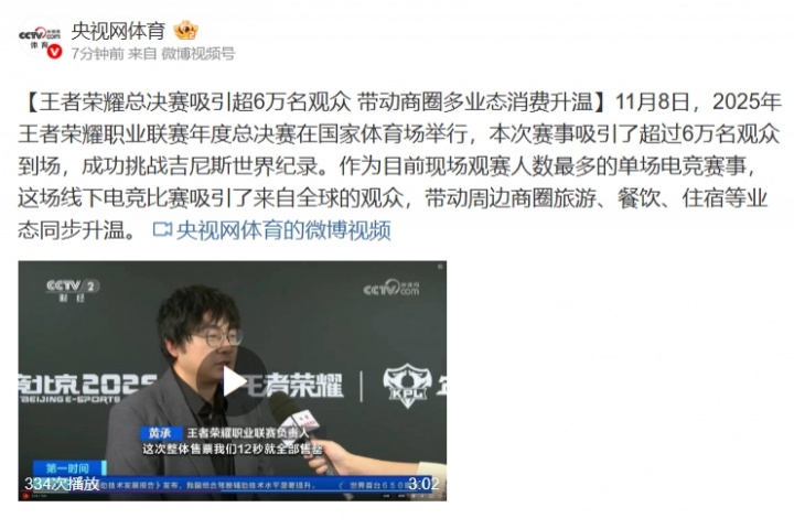 直播吧11月9日讯 昨日,王者荣耀年度总决赛在北京鸟巢打响,此次决赛打破单场电竞赛事观众人数吉尼斯记录,为此央视网体育更新微博。