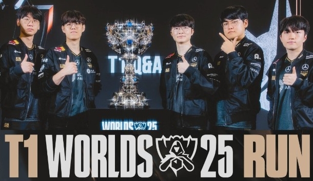 直播吧11月9日讯 2025全球总决赛成都冠亚军决赛,T1击败了对手KT夺得冠军!