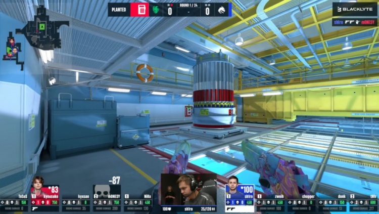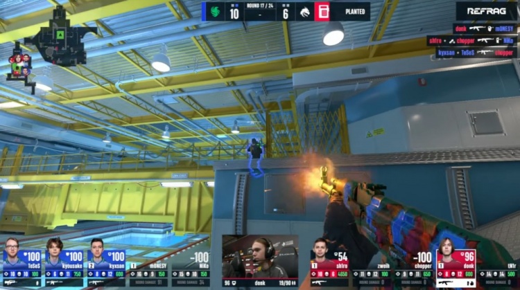 第17局内场zweih与tN1R瞬间被Monesy与K3击杀,donk捡到C4在B下包,猎鹰五人回防,donk爆轰三杀,猎鹰10-7绿龙。