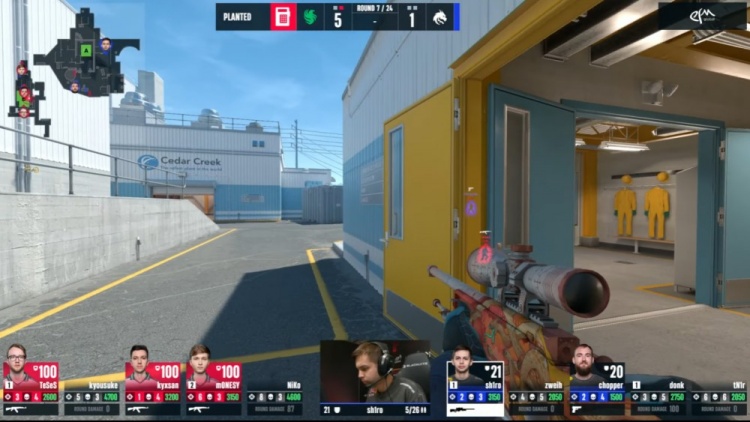 第5局来到长枪,外场京介混烟击杀sh1ro,Niko补掉chopper,tN1R在K1门口击杀Monesy与京介后被换,zweih喷子一枪未开被K3击杀,donk黄房架烟双杀K3与龙哥,残局donk单挑Niko,Niko再去B点下包放在单门门口,donk进点拆包被Niko侧身击杀,猎鹰4-1绿龙。