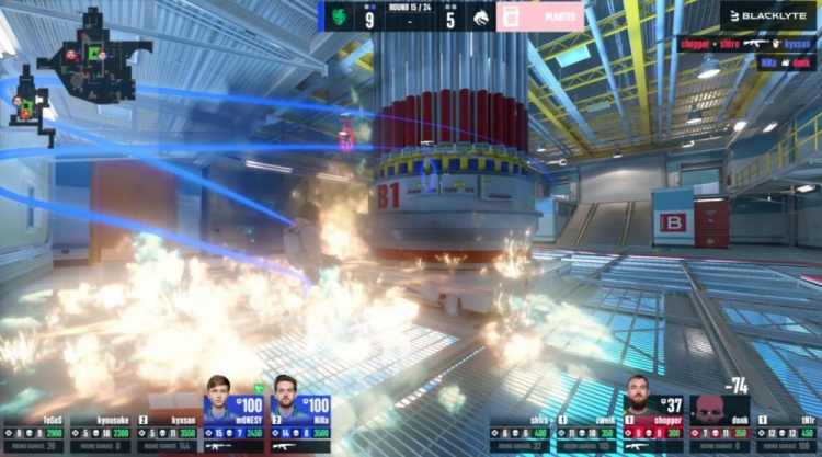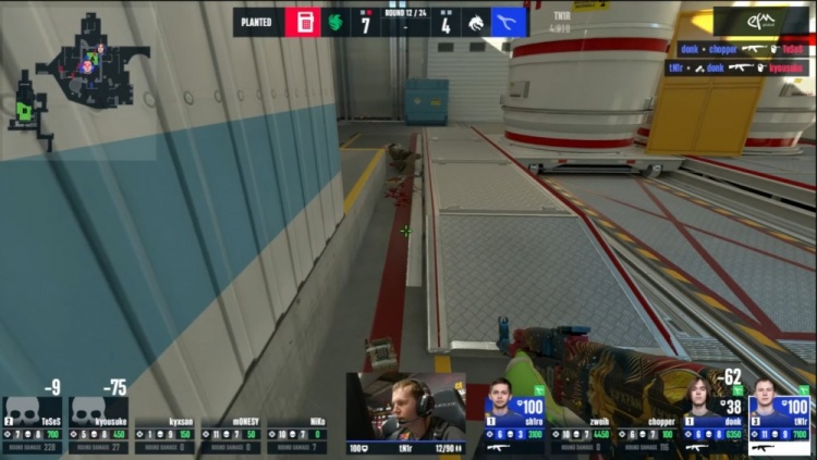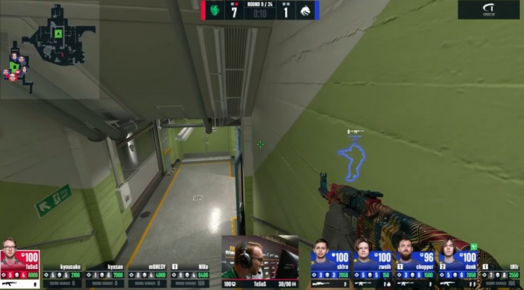 第9局donk外场先杀京介,猎鹰三人带包下楼,tN1R站在B包点击杀玻璃房的K3,Niko将其补掉,单门chopper开门击杀下包的Niko再杀龙哥,donk打掉Monesy,猎鹰7-2绿龙。