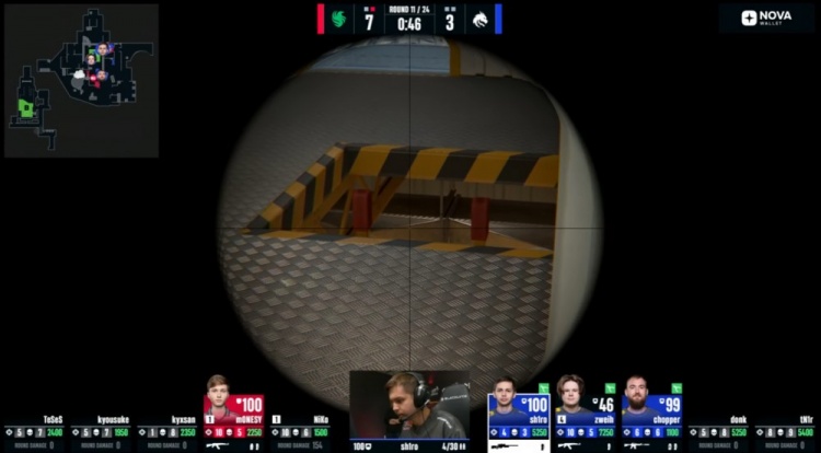 第11局外场刚枪,Niko红箱击杀donk,内场zweih黄房之上爆轰四杀,C4掉在正门,Monesy残局1v3,内场先杀zweih后被sh1ro大狙轰掉,猎鹰7-4绿龙。