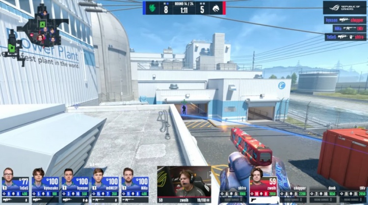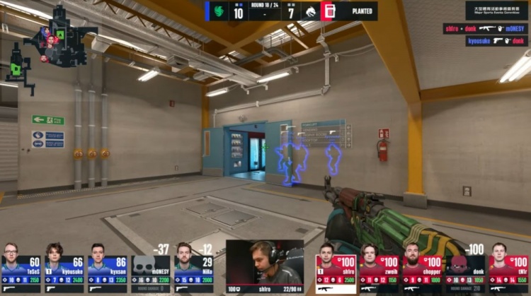第15局来到长枪回合,京介与龙哥铁板与黄房分别前顶被杀,K3看A点换掉zweih,铁板Niko击杀tN1R,Monesy上三楼上找人,K3击杀sh1ro,Niko火烧donk后拆包得手。猎鹰10-5绿龙。