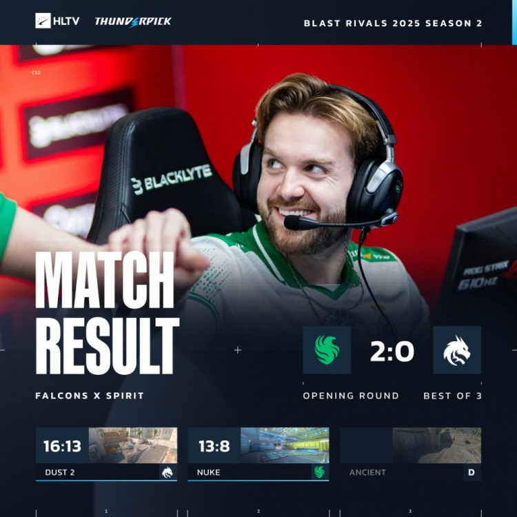 直播吧11月12日讯 CS2大赛Blast对抗赛香港站终于开战,在A组焦点之战中,Falcons轻松横扫Spirit,晋级胜者组对阵PUA,Spirit落入败者组将在明日生死战对阵The Mongolz。