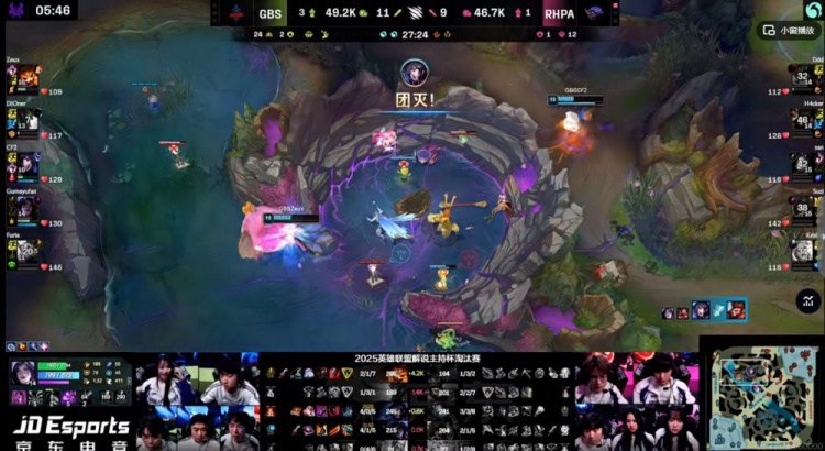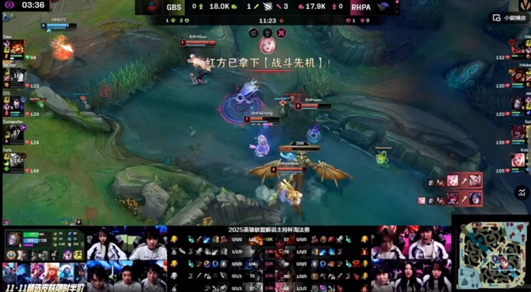 【14分钟】下路LangX纳尔拆塔+对位变大单杀,直接切死了呆呆剑魔,随后野区团战RHPA先手强杀掉了GBS野辅,LangX纳尔赶到正面,呆呆剑魔交TP直接落到对手人群里,RHPA想救队友结果被反打,GBS双C收割,这波反而是GBS的2换3,还拿下了先锋+第三条小龙!经济差快4K了!