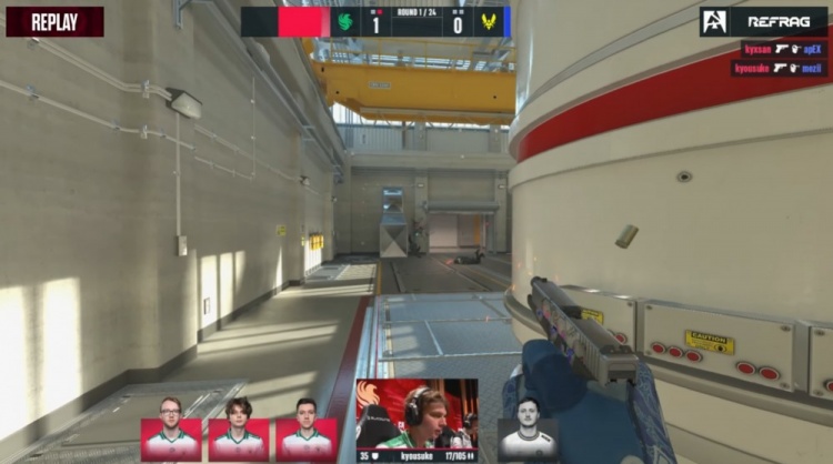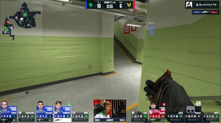 第17局Monesy掏出大狙,Zywoo掏出AK,小蜜蜂三把AK一把咖喱一把tec-9,Niko拉出铁板双杀mezii与apex,Monesy大狙轰掉火仔,Zywoo补掉京介,猎鹰11-9小蜜蜂。