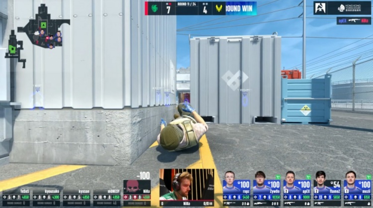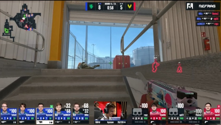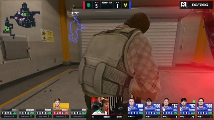 第8局前Niko与mezii均0-6。开场龙哥铁板手撕Zywoo大狙,Monesy大狙再轰火仔与mezii,京介点掉apex,Niko收掉ropz终于开张,猎鹰7-1小蜜蜂。