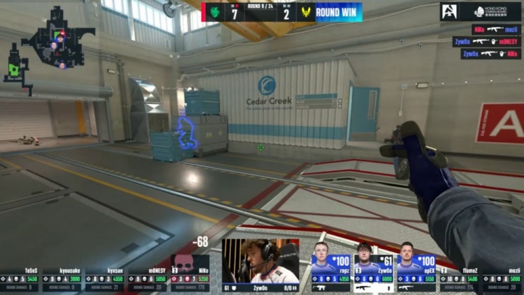 第19局Zywoo生气AK打爆内场轰出五杀团灭猎鹰,猎鹰12-10小蜜蜂。