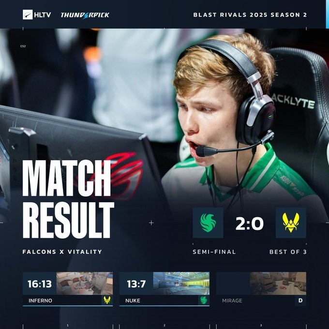 直播吧11月15日讯 CS2大赛BLAST竞争赛香港站半决赛,Falcons两图横扫Vitality,晋级决赛对阵黑豹!