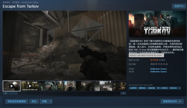 直播吧11月16日讯 著名搜打撤游戏《逃离塔科夫》(Escape from Tarkov)1.0正式版现已登陆Steam商店,国区售价242.25元,支持中文。
