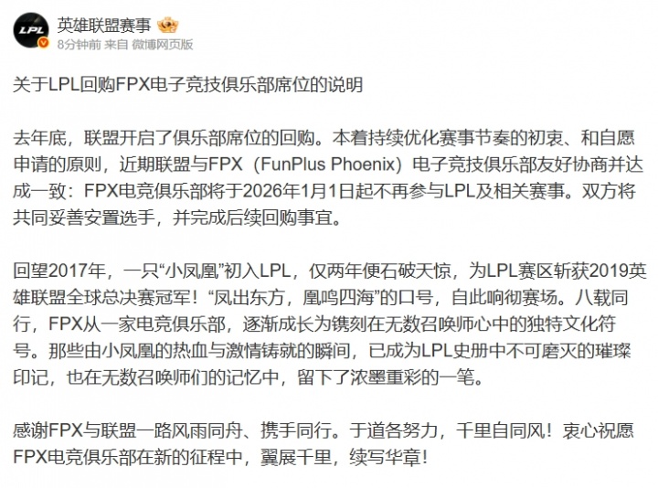 去年底,联盟开启了俱乐部席位的回购。本着持续优化赛事节奏的初衷、和自愿申请的原则,近期联盟与FPX(FunPlus Phoenix)电子竞技俱乐部友好协商并达成一致:FPX电竞俱乐部将于2026年1月1日起不再参与LPL及相关赛事。双方将共同妥善安置选手,并完成后续回购事宜。