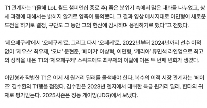 而关于Gumayusi离队,T1相关人员表示:今年英雄联盟全球总决赛结束后,我们在良好的氛围中进行了很多交流,关于更具体的过程,双方同意不予公开。最终,就像视频中所说的那样,李珉炯选手决定踏上新的挑战,俱乐部也对他一直以来的奉献表示感谢,并决定为他应援。