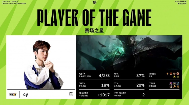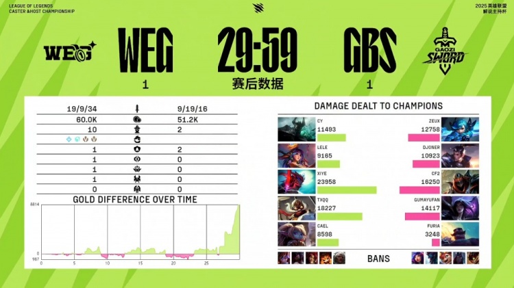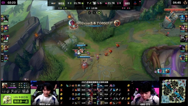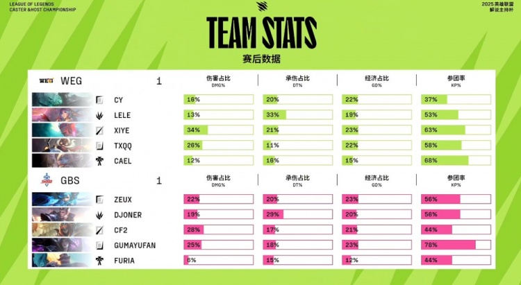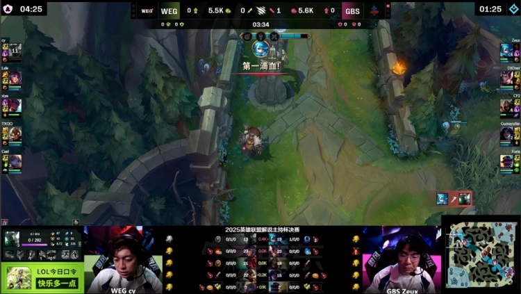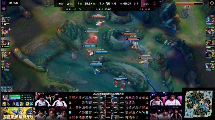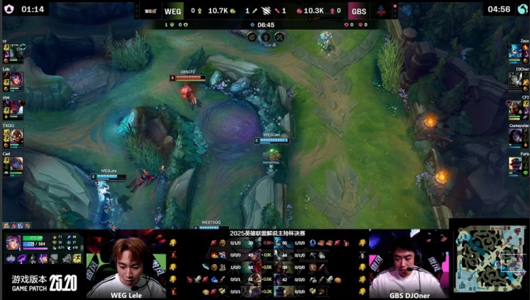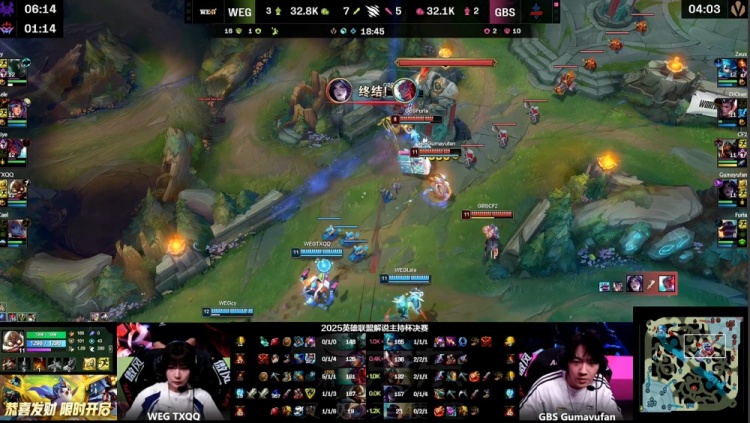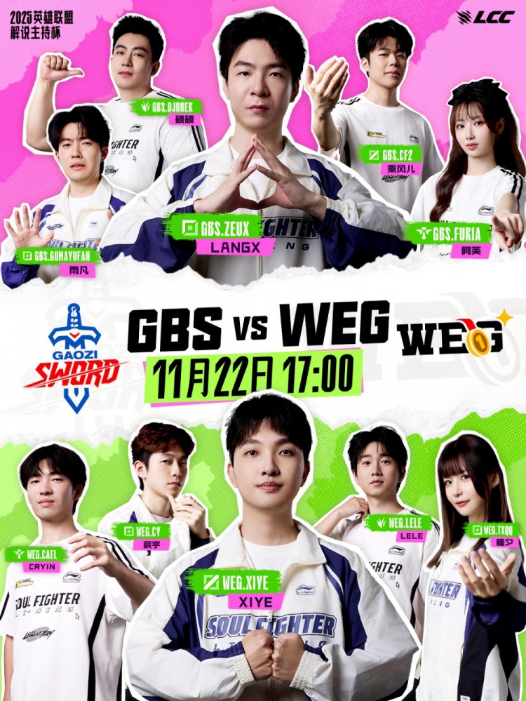 直播吧11月22日讯 2025英雄联盟解说主持杯决赛,由LangX率领的搞子剑(GBS)对阵xiye带领的WE金(WEG)!