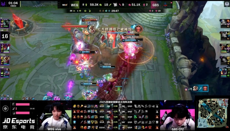 【28:51】中路团战,xiye永恩越塔单杀阿芙布隆,下路宸宇推掉GBS二塔,WEG经济领先5k。随后WEG推掉GBS中路水晶,冲上GBS高地,狼X与硕硕睡着,WEG打出0换4,一波推平GBS基地扳回一城。
