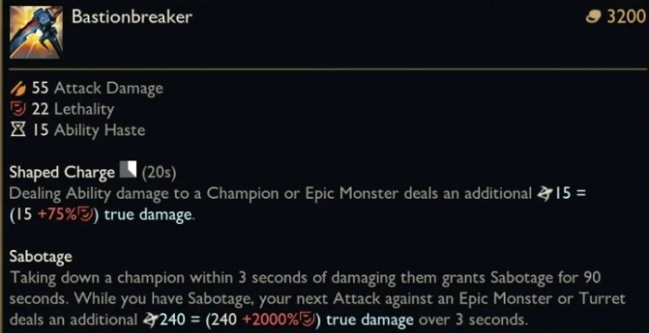 你过去三秒内伤害过的敌方英雄死亡会为你提供一个破坏效果,你对史诗级野怪或者防御塔的下一次攻击会消耗掉这个效果,造成基于穿甲的额外持续伤害